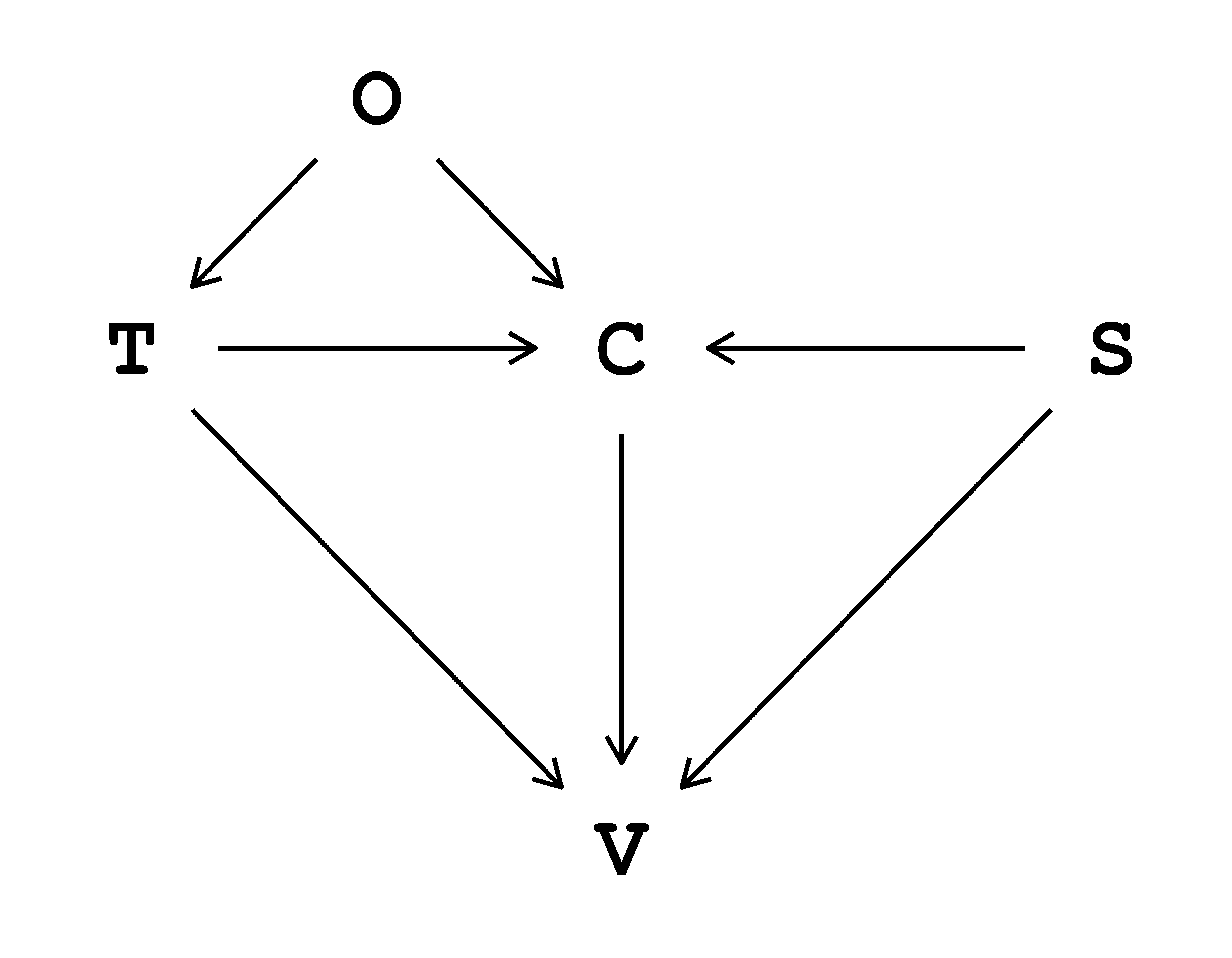 The data-generating process is the specific process that generates the observed data. In reality, this process is unknown and understanding it is, in a general sense, the ultimate aim of science. Here, we assume this process is known and describe it via a directed acyclic graph (DAG) in Fig. 3.1. In this DAG,1 indoor air temperature \((\text{T})\) and biological sex \((\text{S})\) influence thermal sensation vote \((\text{V})\) both directly and indirectly, passing through clothing insulation \((\text{C})\) In addition, thermal sensation vote \((\text{V})\) is influenced indirectly by outdoor air temperature \((\text{O})\) through indoor air temperature \((\text{T})\) and clothing insulation \((\text{C})\).