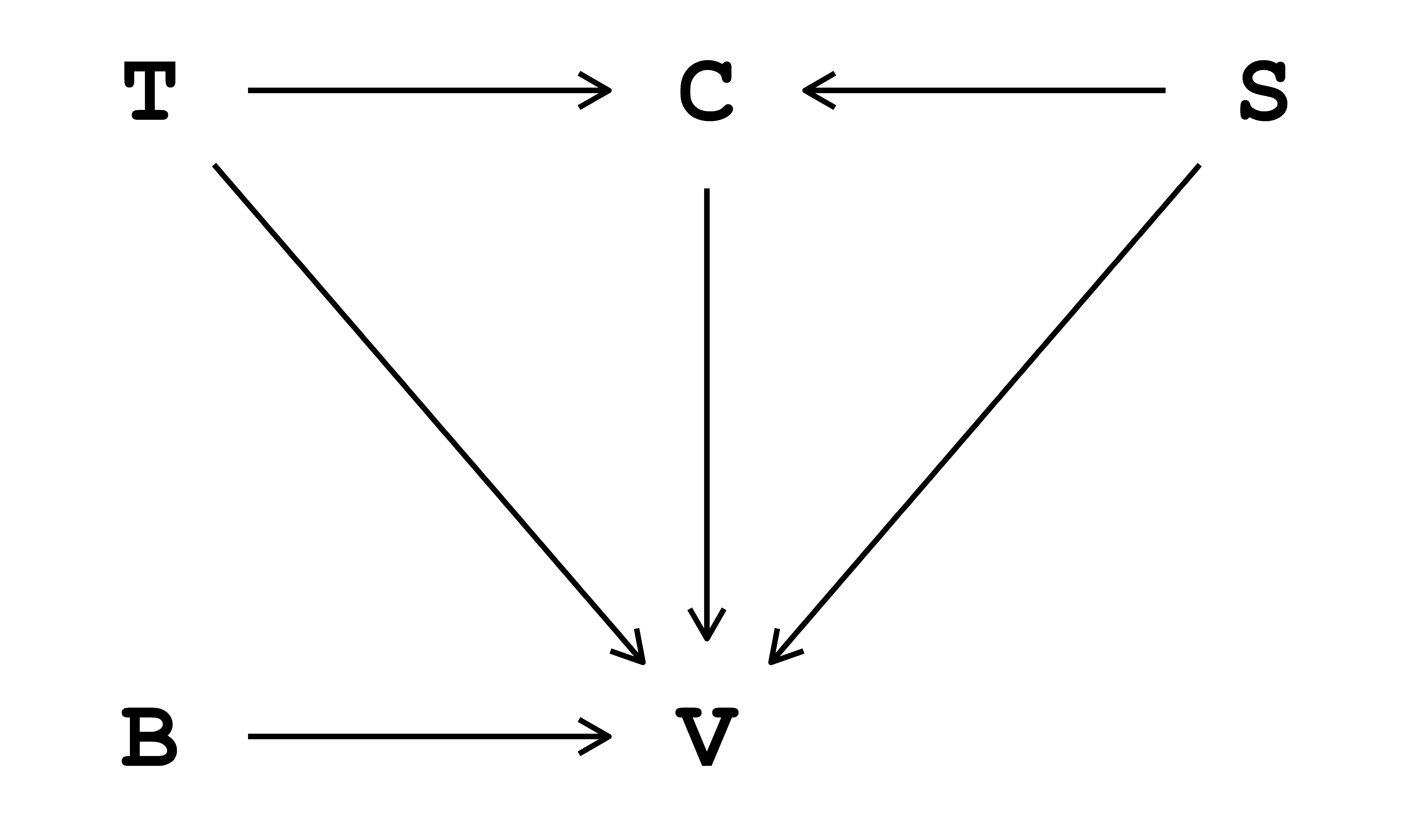 V ~ S + C + T + B,